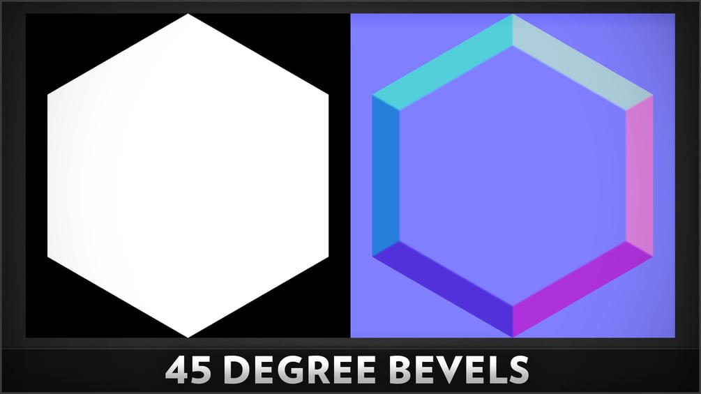 When working with trim sheets, I always want to start with a perfect 45 degree bevel. This node bevels the same way the default bevel node works, but also outputs a perfect 45 degree angle normal.