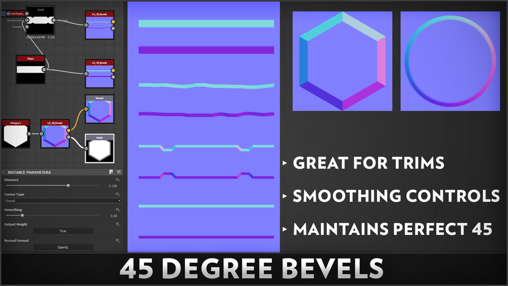 When working with trim sheets, I always want to start with a perfect 45 degree bevel. This node bevels the same way the default bevel node works, but also outputs a perfect 45 degree angle normal.